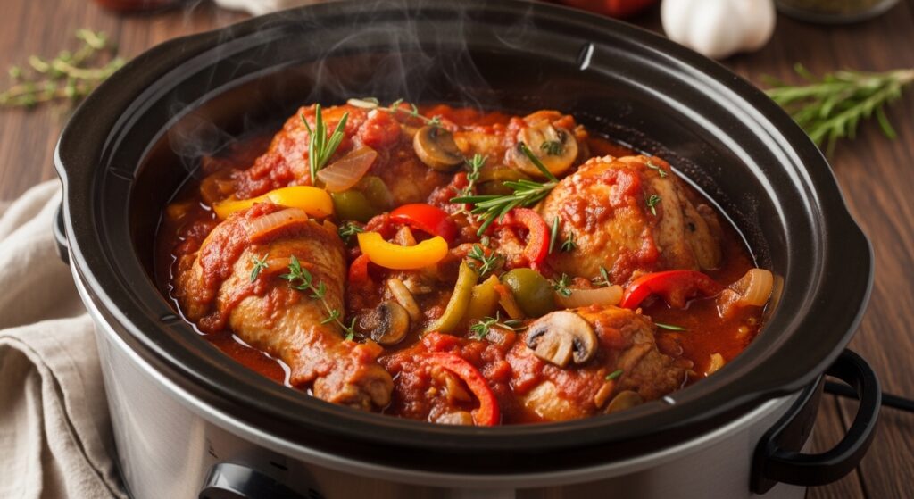 This slow cooker chicken cacciatore is a comforting, rustic dish inspired by traditional Italian “hunter-style” cooking. Tender chicken thighs are