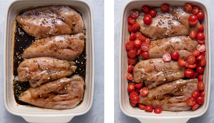 - Cherry tomatoes — They burst and soften in the oven, releasing their juice into the balsamic sauce and adding brightness to what would otherwise be quite a rich dish. Grape tomatoes work just as well.