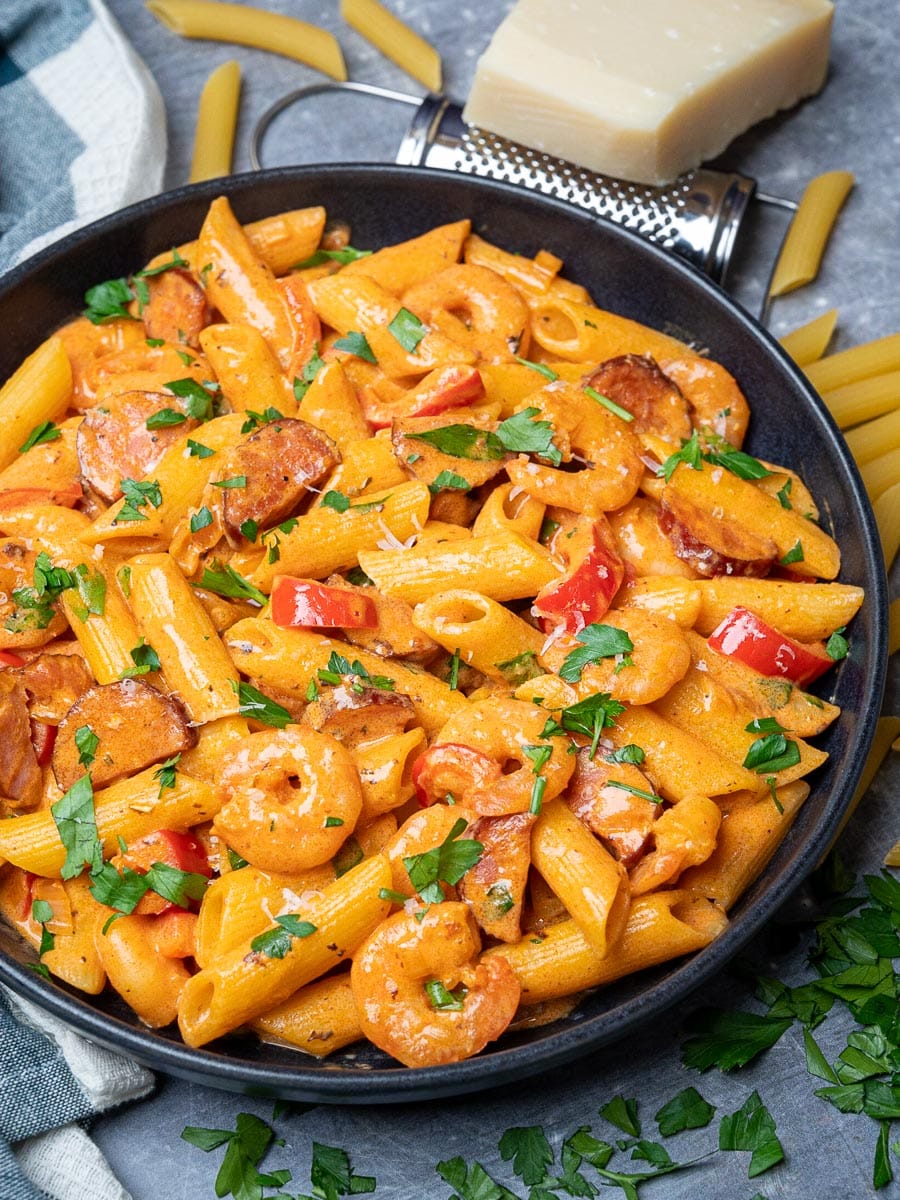 Picture tender shrimp, crispy bites of smoked sausage, and pasta wrapped in a luxuriously creamy, spicy Cajun sauce that’s full of flavor and just the right amount of heat.