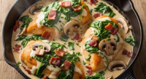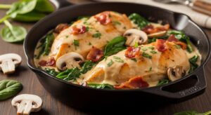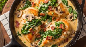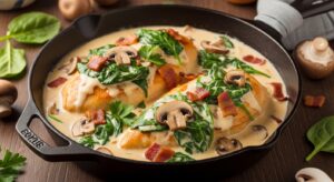 The combination of savory bacon, earthy mushrooms, and creamy spinach creates a deeply flavorful sauce that coats every bite of juicy chicken.